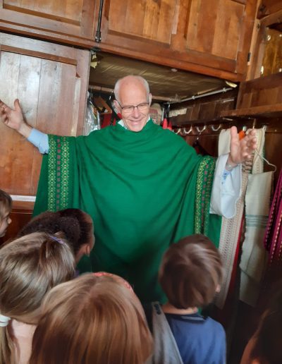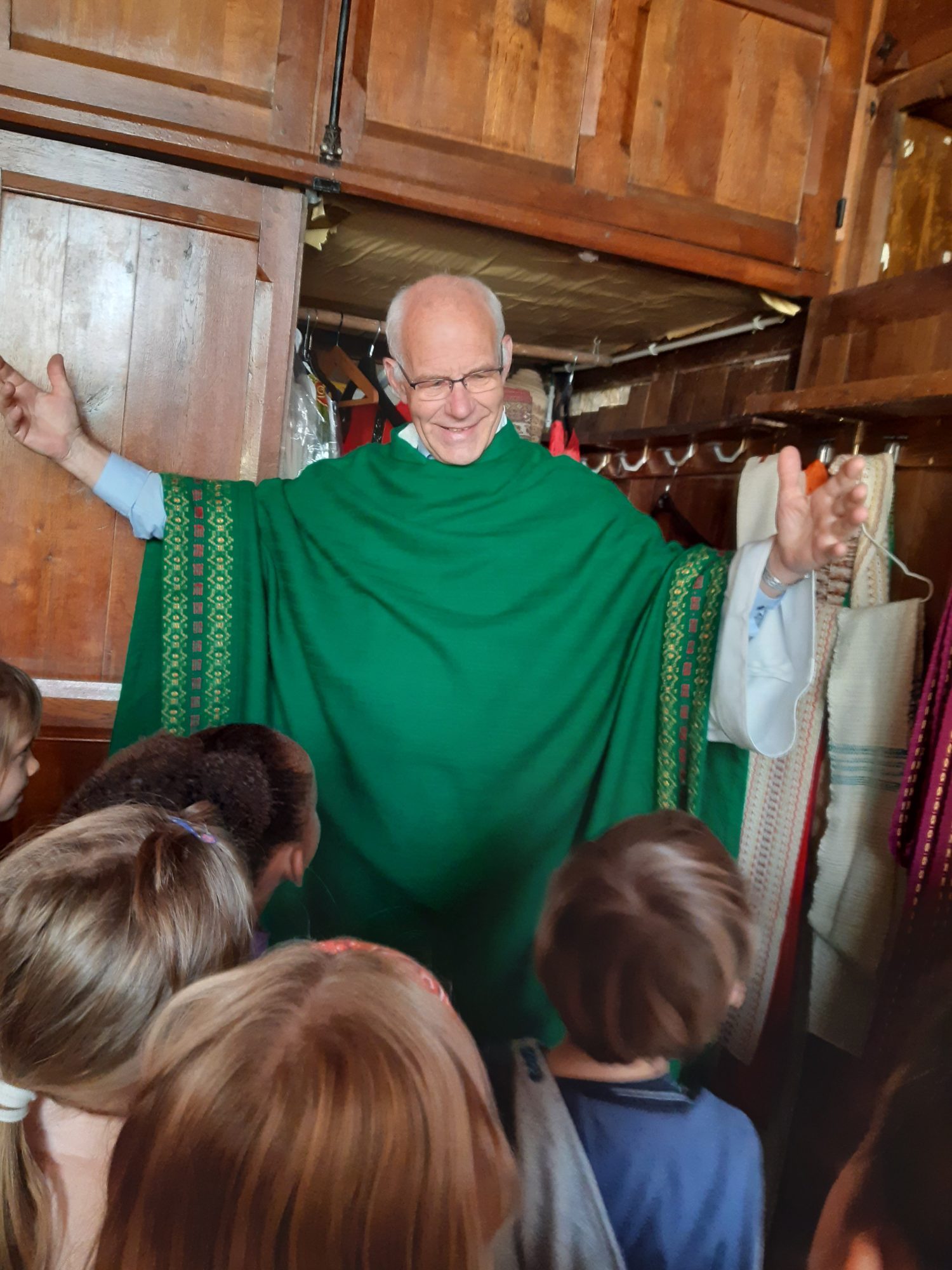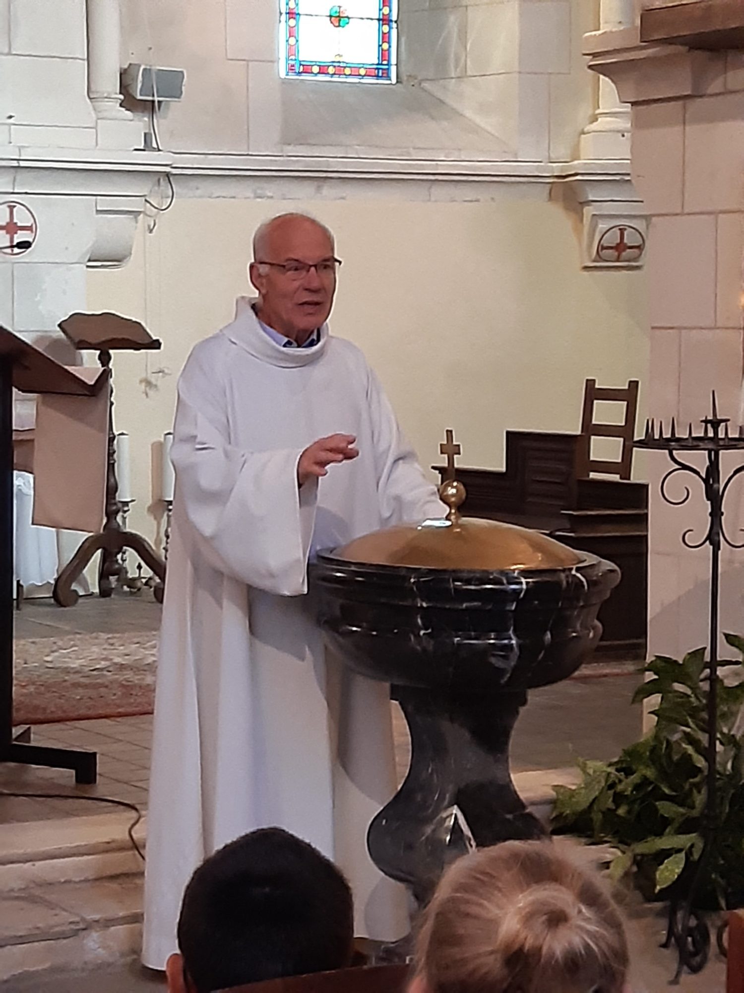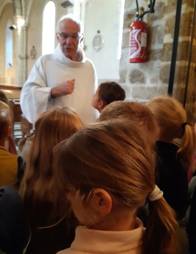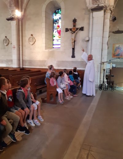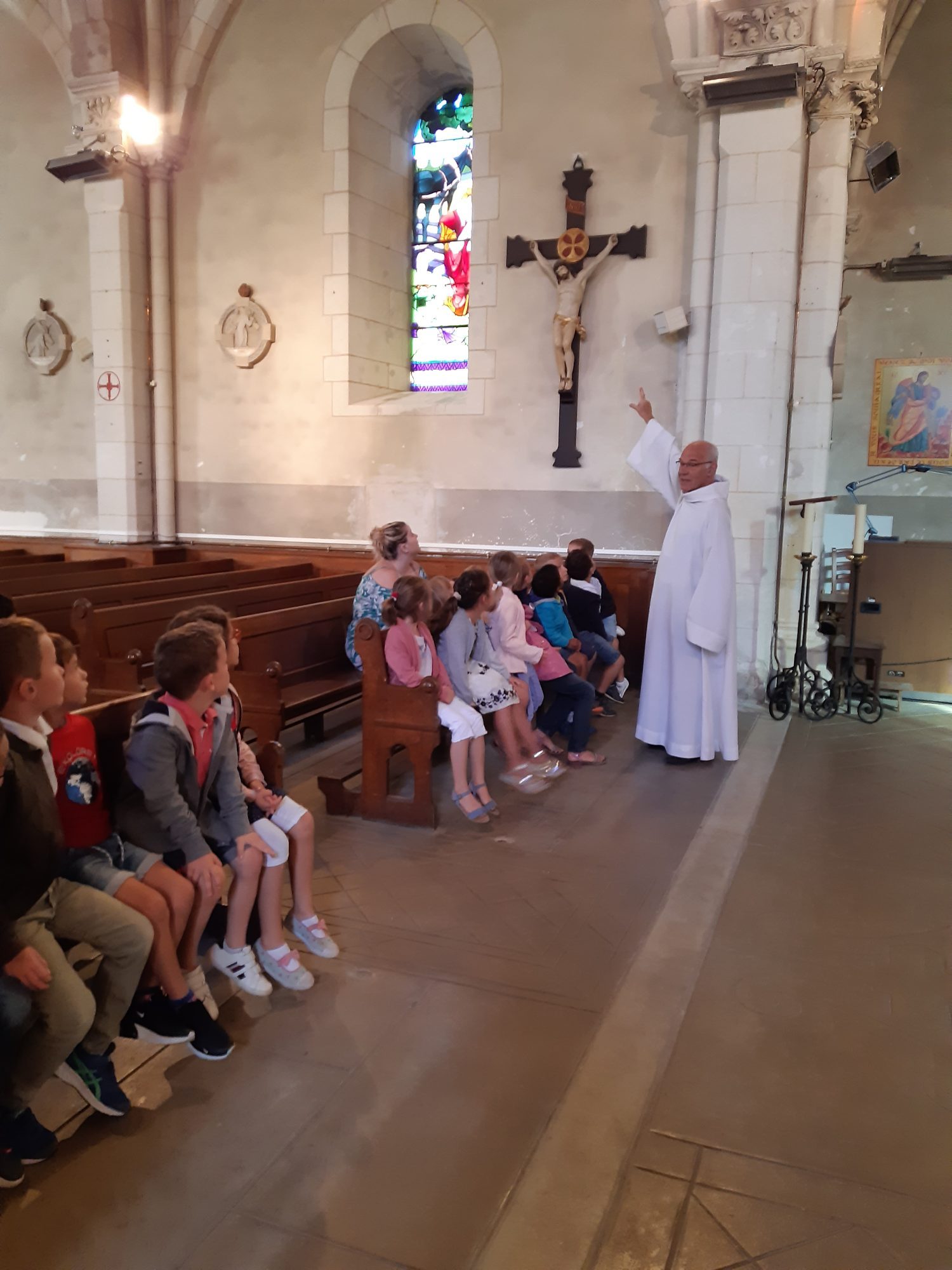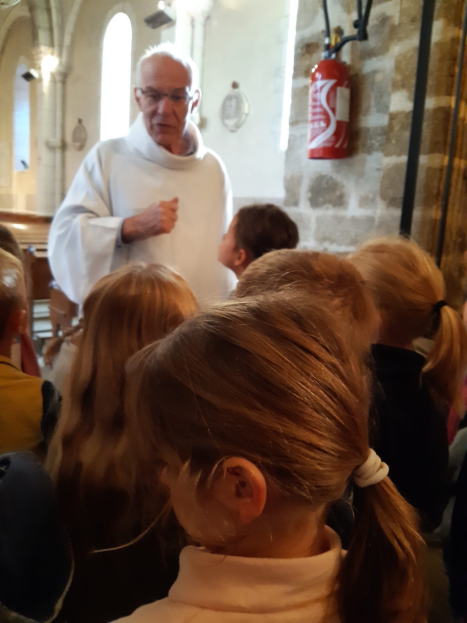 Nous avons découvert l’église en compagnie du Père Augu.Il a présenté aux enfants les différentes statues et vitraux de l’église Saint Aubin.