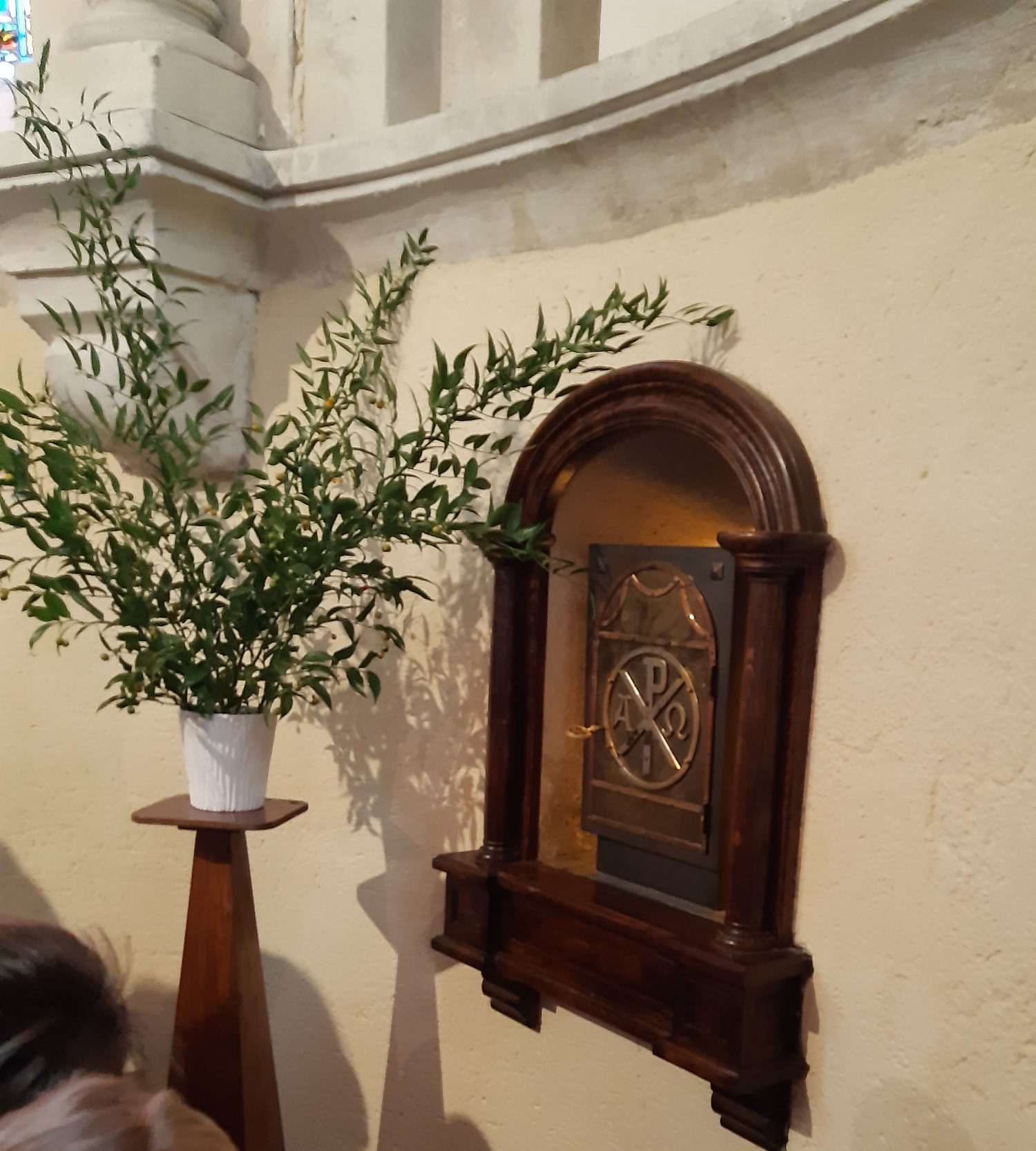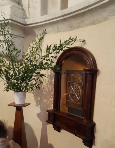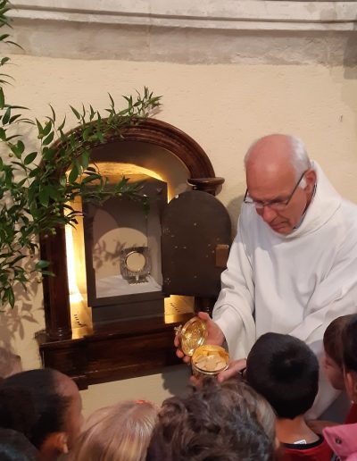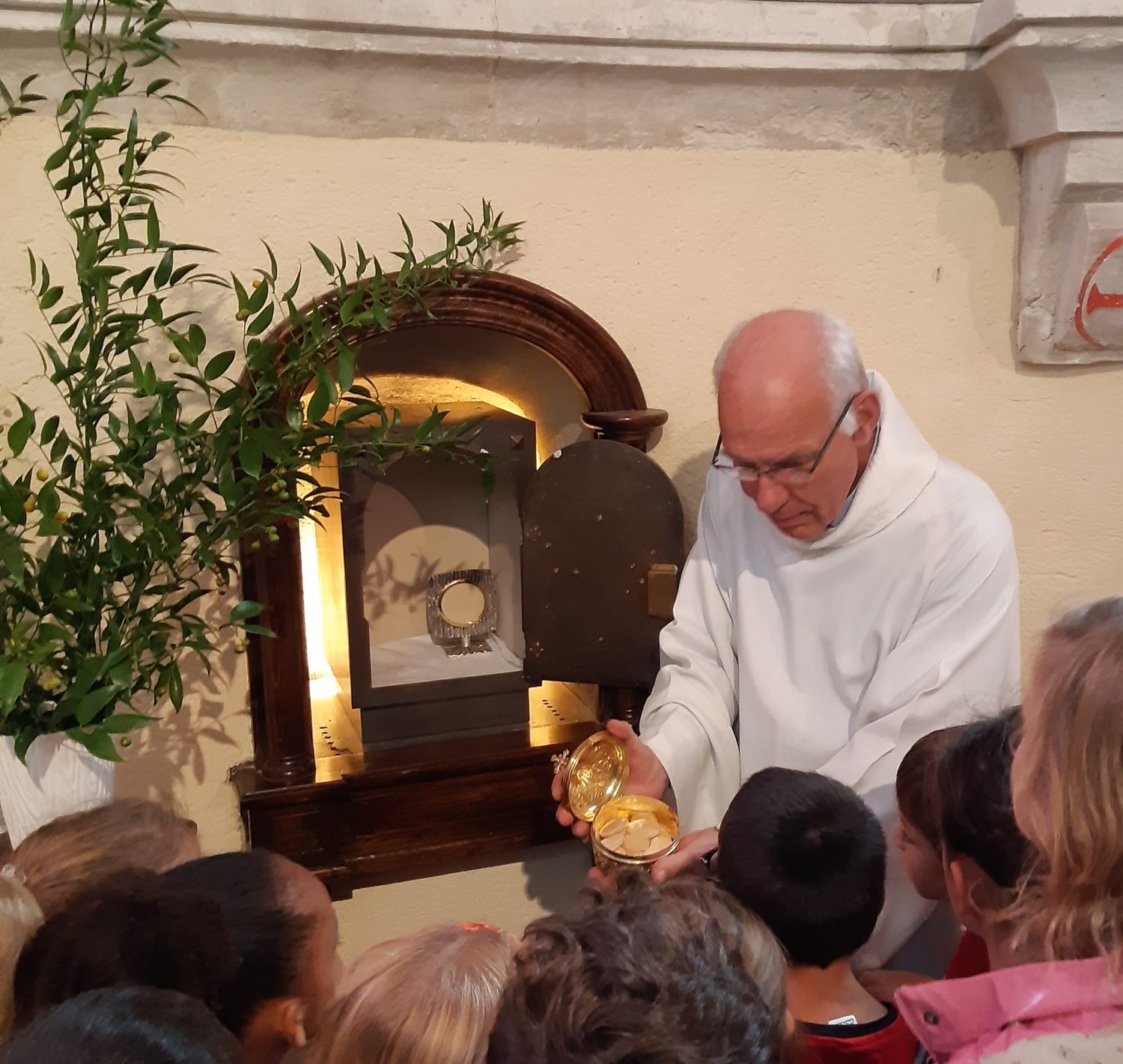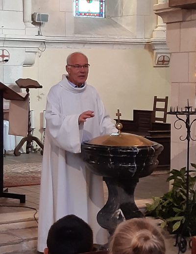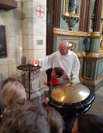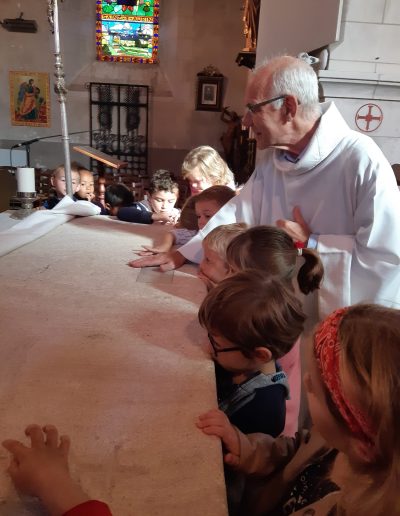 Les enfants ont pu toucher l’autel et découvrir les croix gravées sur celui-ci.Le prêtre leur a présenté les fonds baptismaux, le Saint Chrême et ils ont pu toucher l’eau bénite.