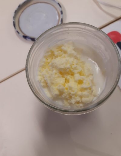 Nous avons appris que le liquide que l’on obtient une fois que les petits grains de beurre se forment s’appelle le petit lait. Une fois égouttés, les grains de beurre sont lavés puis on peut former la motte, ensuite on la met au réfrigérateur.