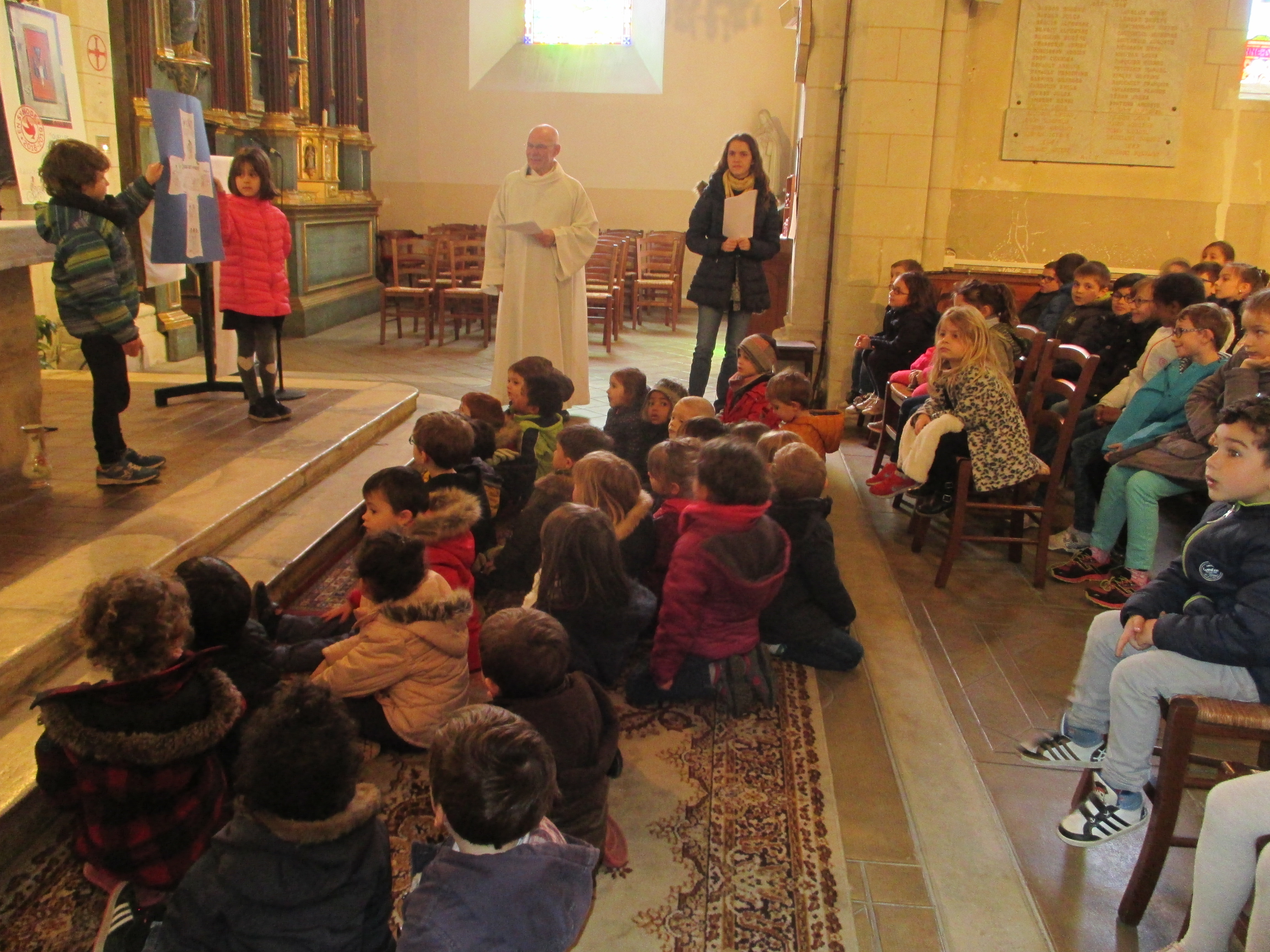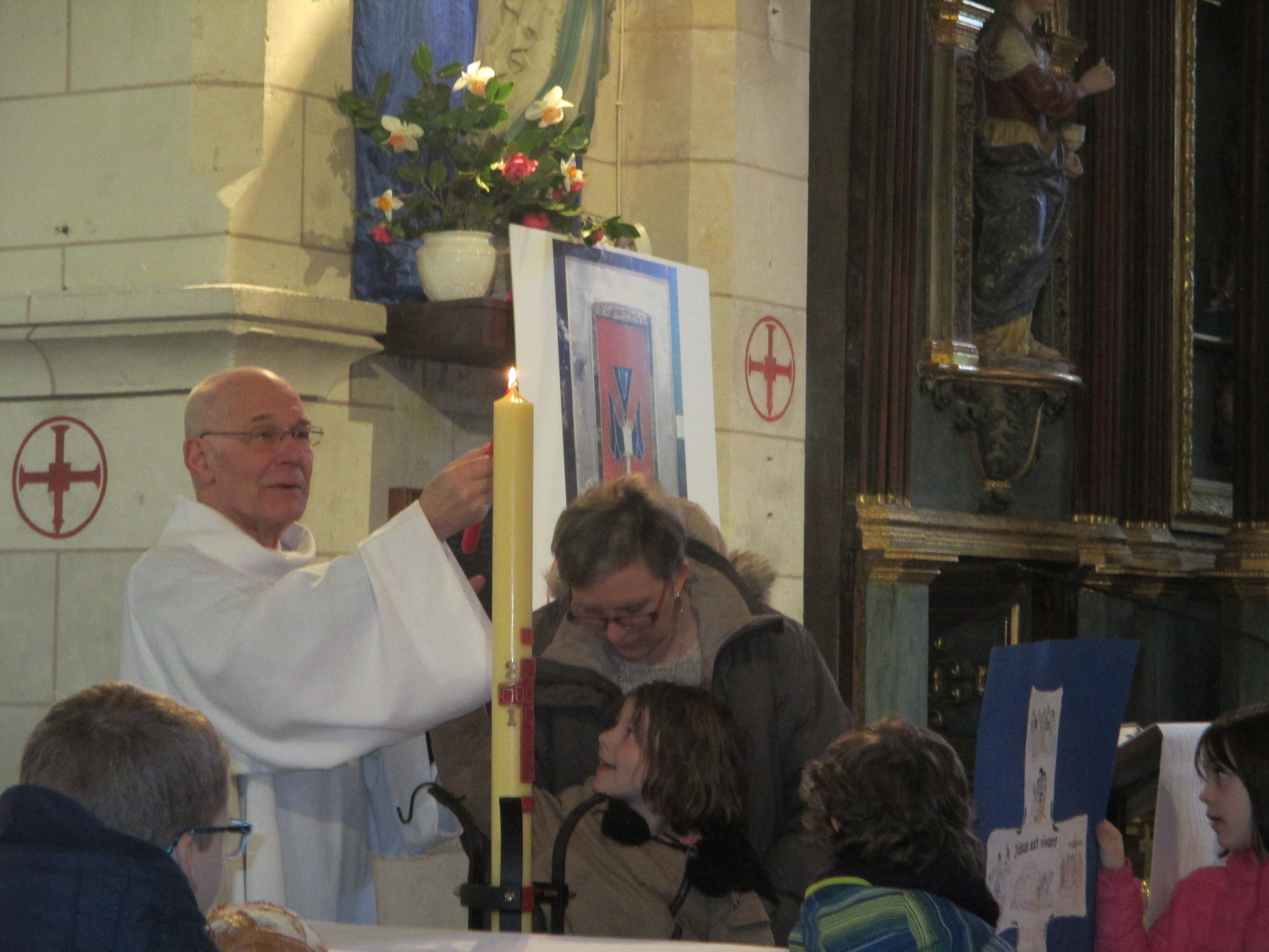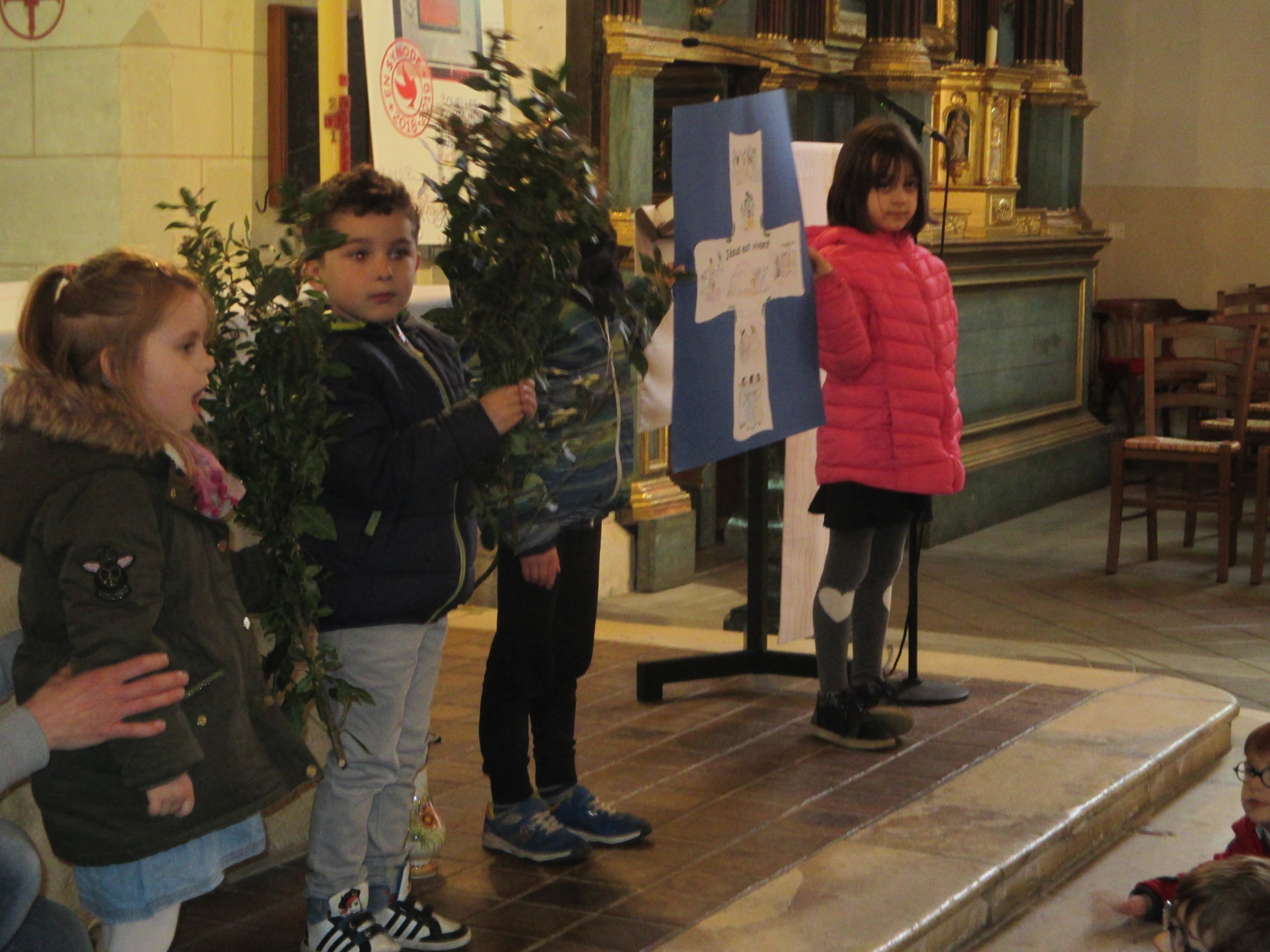 Nous avons retracé le chemin de Pâques: nous avons apporté des branchages, du pain pour se souvenir du dernier repas de Jésus, une croix, des pierres et le cierge Pascal a été allumé pour se rappeler que Jésus est vivant pour toujours.