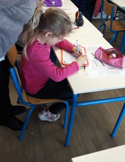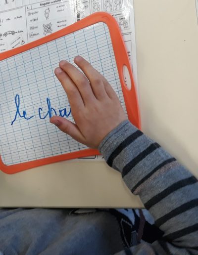 Ni une ni deux nous avons cherché qui était Léonard de Vinci et découvert quelques unes de ses œuvres. Ensuite nous nous sommes exercés à écrire de la main gauche sur l’ardoise.