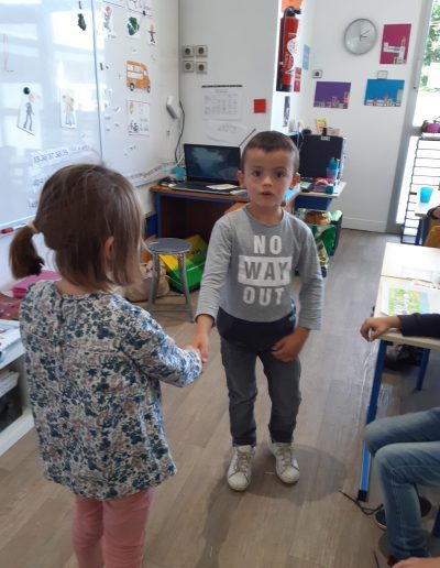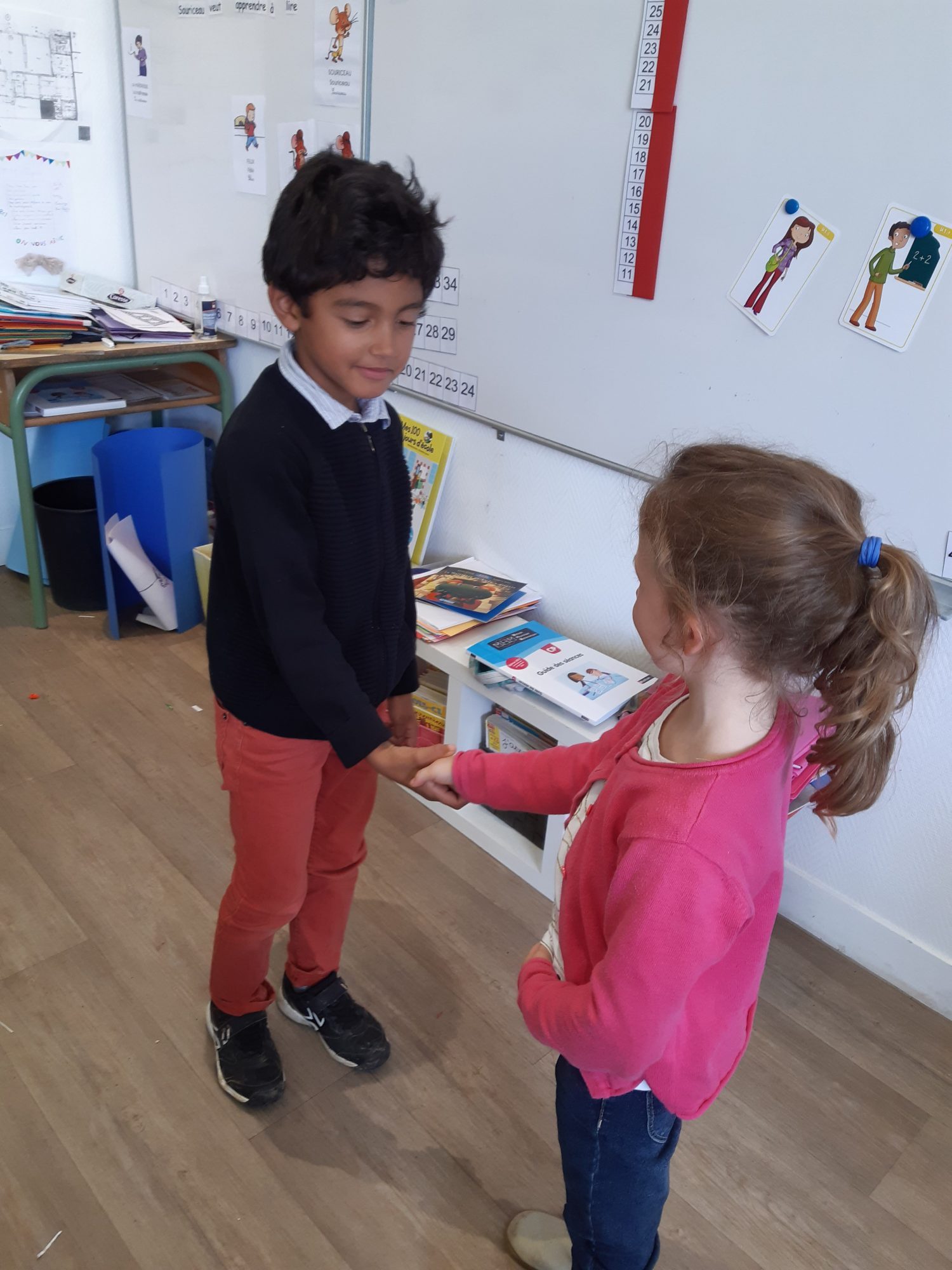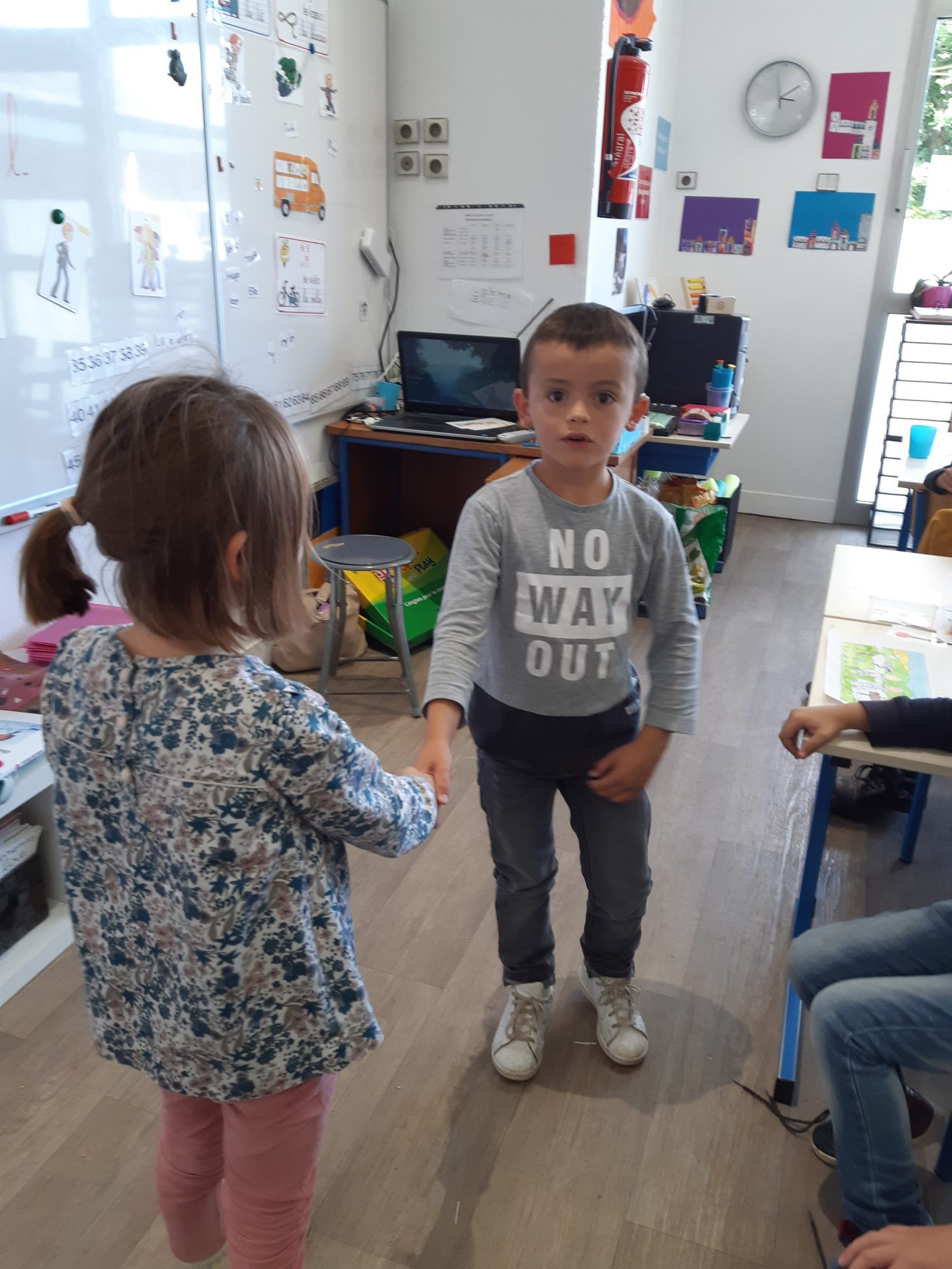Cette année pour apprendre l’anglais, nous écoutons des chansons et découvrons des histoires . Mais nous réalisons des petites scénettes en anglais. Nous avons appris à dire bonjour , au revoir et à se présenter.